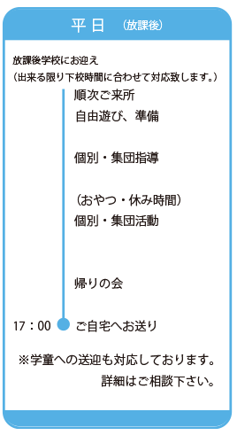 平日のご利用時間は、原則としては午後の放課後ですが、状況によっては午前のご利用も対応できる場合があります。